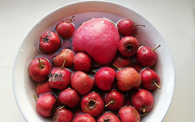 1、先将山楂和苹果放入盐水中清洗干净,山楂中间有个小孔,不容易清洗,可以放在盐水中浸泡一会再洗。