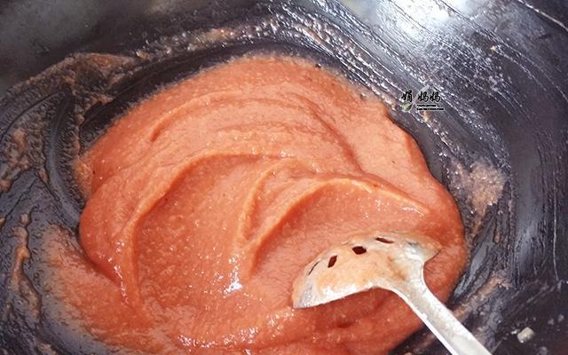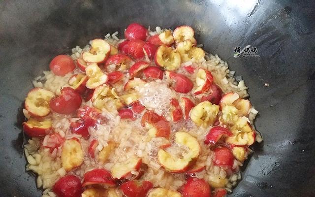 4、山楂的果肉是粉质的,烧一会就会变软,这时候用勺子全部给它压成泥状就可以了。