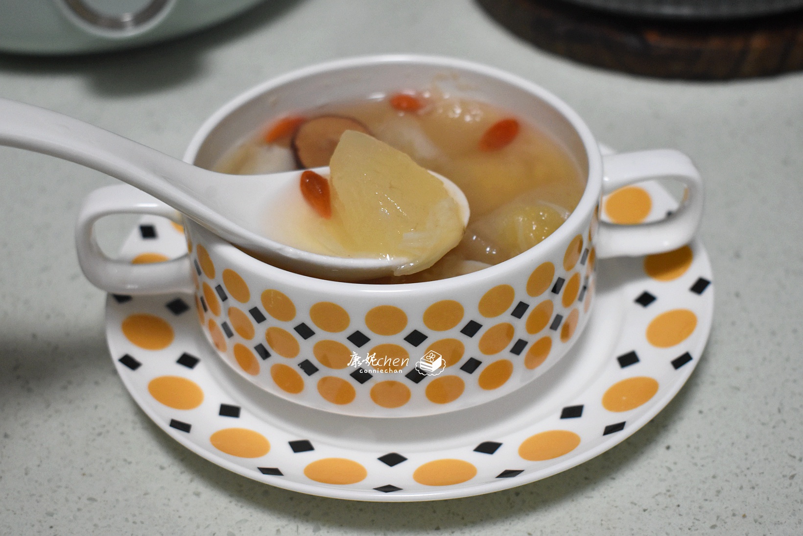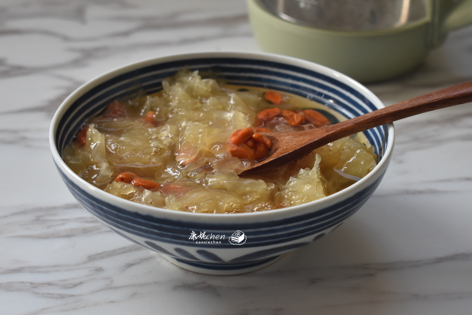 【枸杞银耳羹】枸杞有清肝明目和延缓衰老的作用,枸杞银耳羹用了20克枸杞、1朵银耳和30克冰糖,这次用了新鲜银耳,新鲜银耳不需要浸泡,煮20分钟就可以出胶。把银耳和1升清水放入煮锅,用中火煮20分钟,加入枸杞和冰糖,边煮边搅拌,把冰糖煮融化就可以关火了。