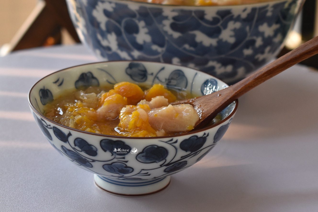 【南瓜香芋糖水】香芋含有较多的粗蛋白、淀粉、聚糖、粗纤维和糖,蛋白质的含量比一般的其它高蛋白植物如大豆之类都要高,香芋煮出来的糖水香味浓郁,糖水绵软香滑。