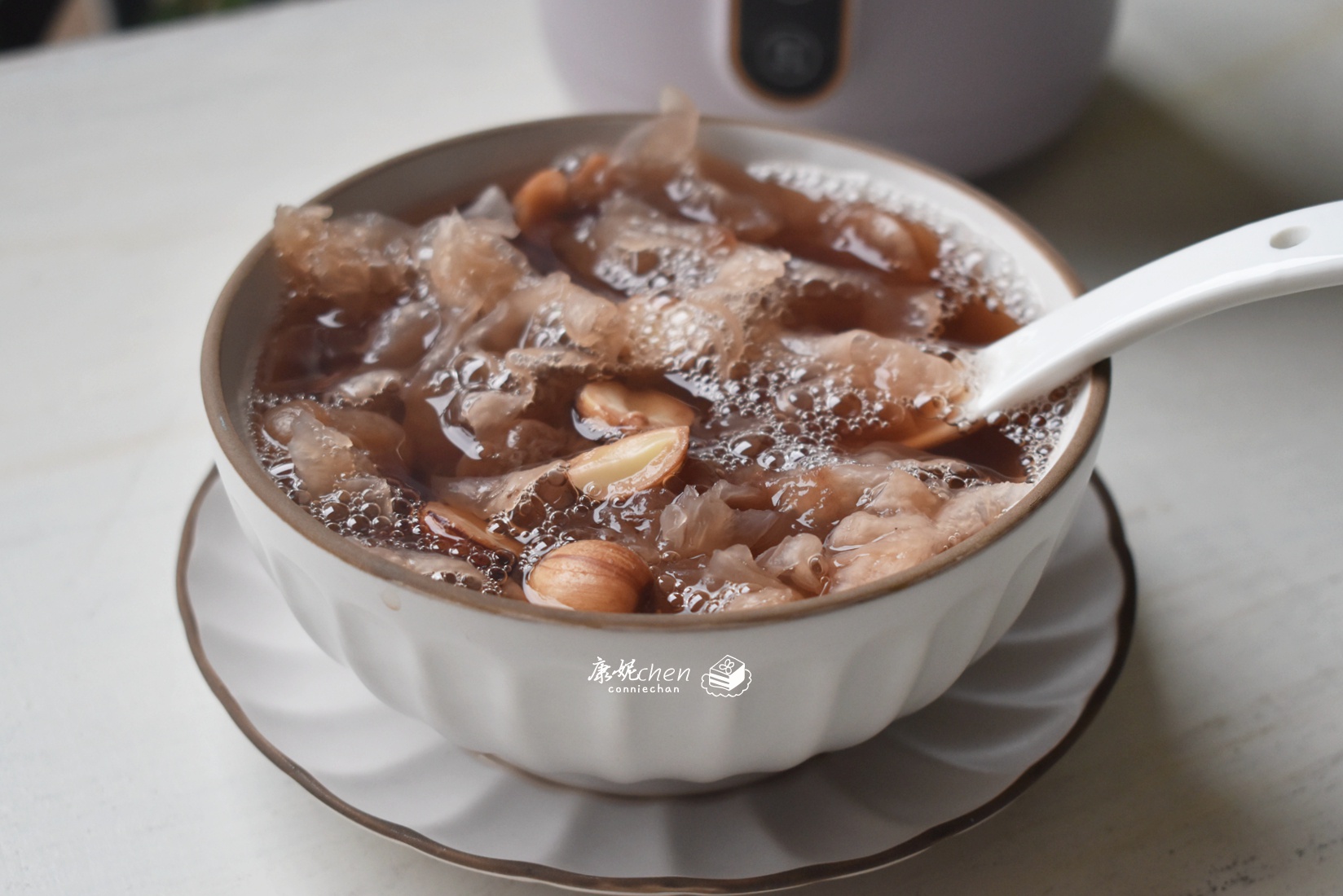 莲子桂圆银耳羹用了10克干银耳、20克莲子、15克桂圆 ,先把银耳用清水浸泡2个小时,去掉银耳根部黄色的硬质部分,把银耳撕成小朵,莲子和桂圆冲洗干净,把银耳、莲子和桂圆放入小煮锅,用小煮锅的炖煮功能,选择炖煮1小时,等小煮锅煮好就可以品尝莲子桂圆银耳羹。这里所写分量适合1-2人,如果家里人数比较多,要增加食材分量,用电饭煲或者大煮锅。