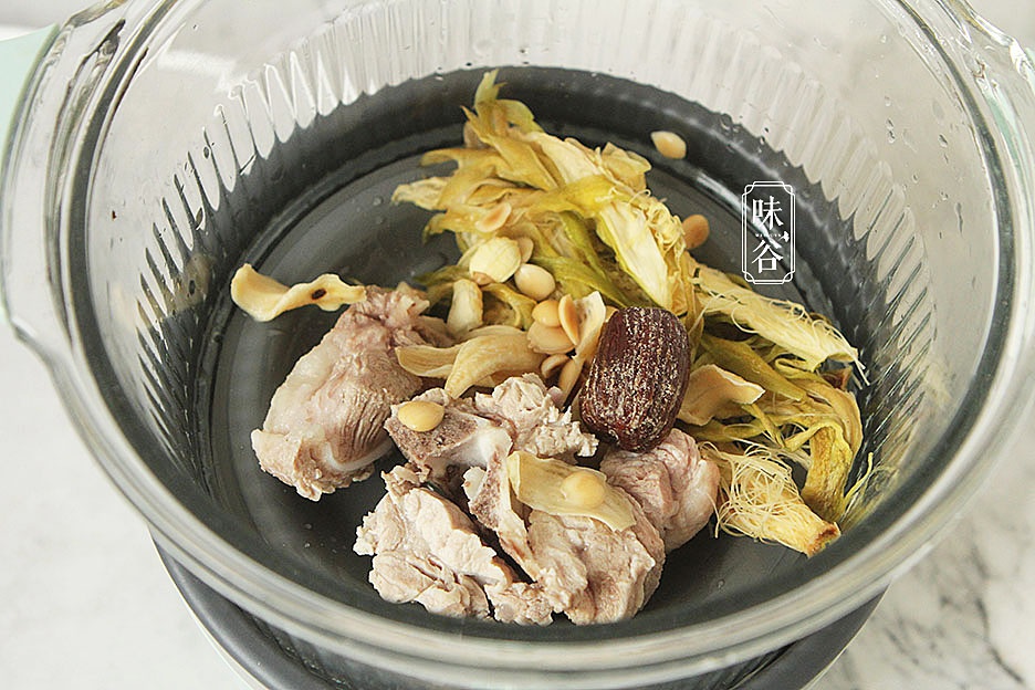 3、将猪骨和霸王花一起放进汤锅里,放入蜜枣、干百合、杏仁和姜片;蜜枣只能一枚,否则汤会太甜腻的。
