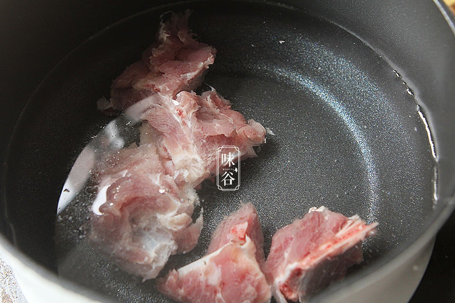 3、猪骨先焯水,先将猪骨冷水下锅煮开2分钟,去掉猪肉外表的脏东西和血水,捞出来备用;