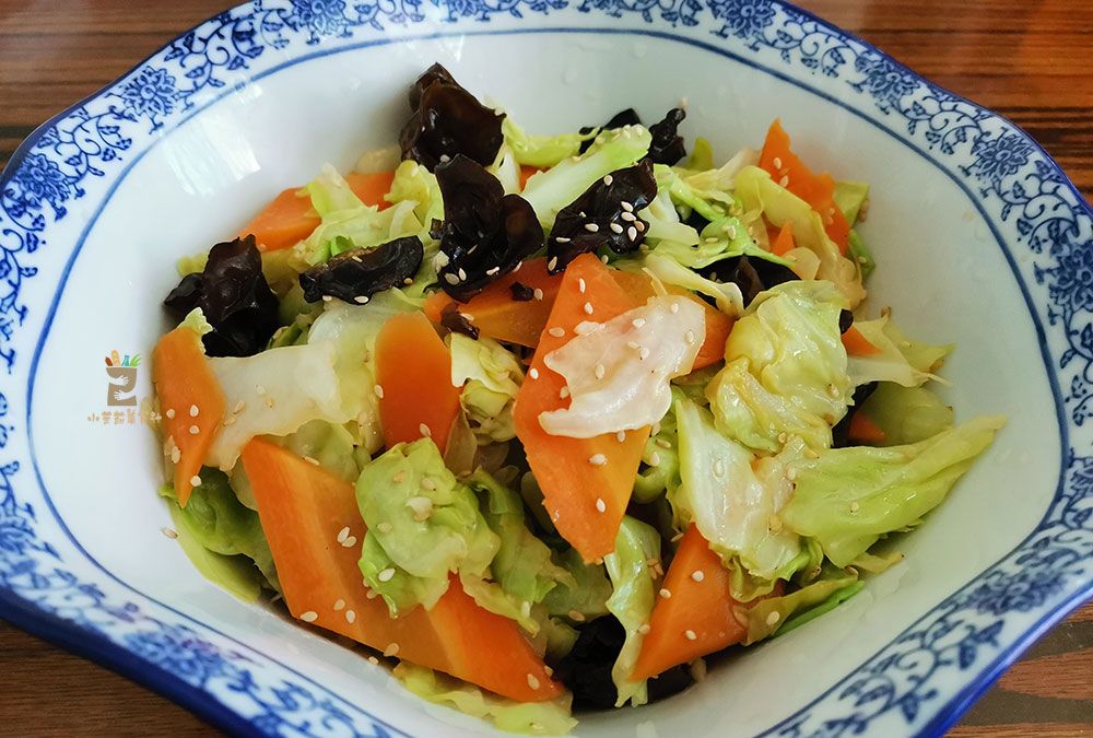 食材准备:卷心菜半个,黑木耳6朵,胡萝卜半个,大蒜2瓣,生抽1勺,白糖少许,食盐适量,花椒8粒,食用油少许,香醋半勺,炒熟的白芝麻少许
