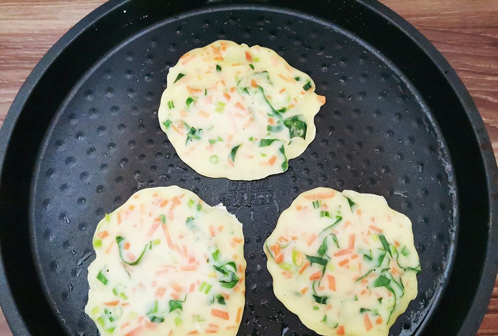 5、在电饼铛内喷入少许食用油,预热以后,将调好的面糊舀入电饼铛内摊薄。中火加热2分钟左右,面糊凝固上色,就熟了。