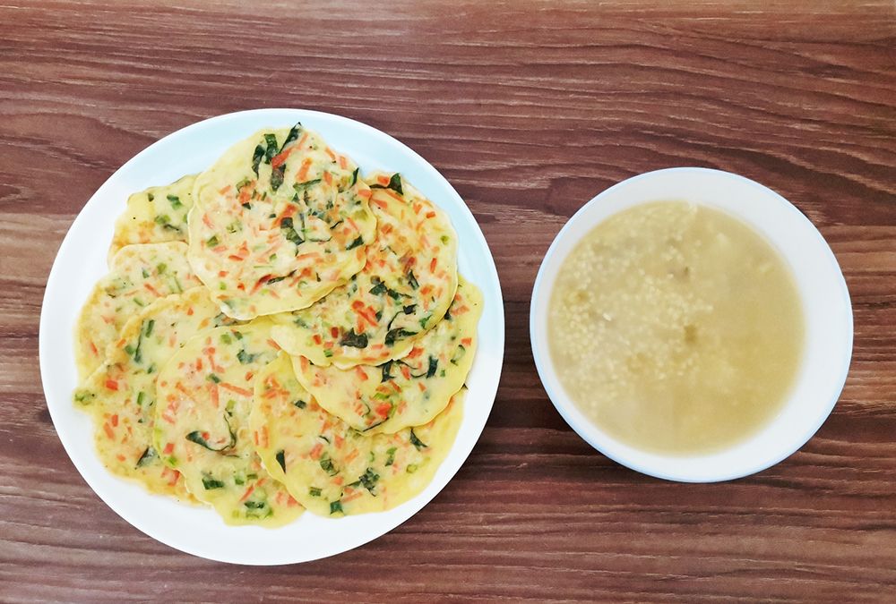 6、做好的菠菜饼搭配小米绿豆粥,清新爽口,营养满满,胃里也特别舒服。