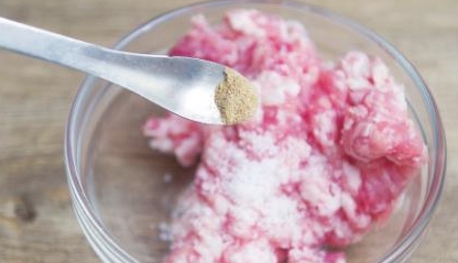 4.擦干猪肉表面的水,剁成肉泥,加入生粉、白胡椒粉和一半的盐。