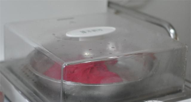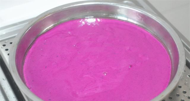 把盘子放进蒸笼里,用中火蒸20分钟,面团就会烤得很焦,不蒸,马上打开盖子,防止火龙果实颜色变淡。