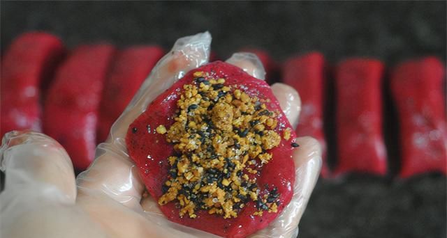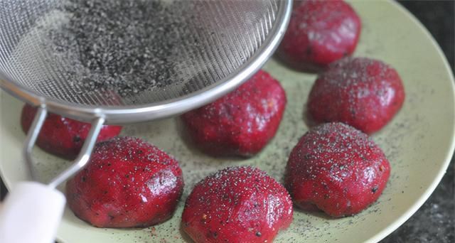 制作的火龙点心可以直接打开吃,撒上黑芝麻粉,可以防止粘性,容易取下来,同时也可以补充钙,微黑芝麻的香味能丰富口感。