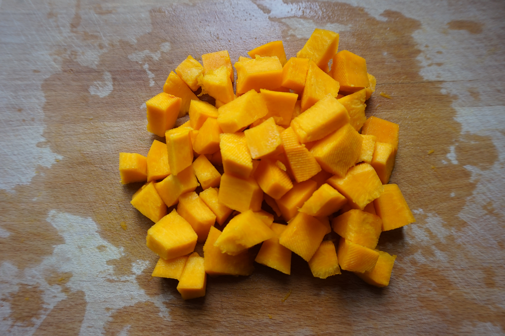 2、准备好南瓜,南瓜最好选择香甜软糯的老南瓜,南瓜削皮之后去籽,然后切成小方块。
