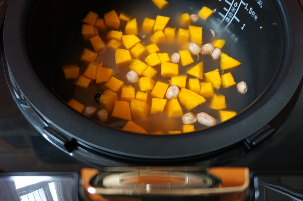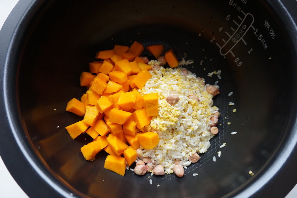 4、再放入切好的南瓜块和淘洗好的小米,大米和花生。