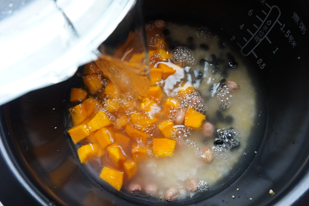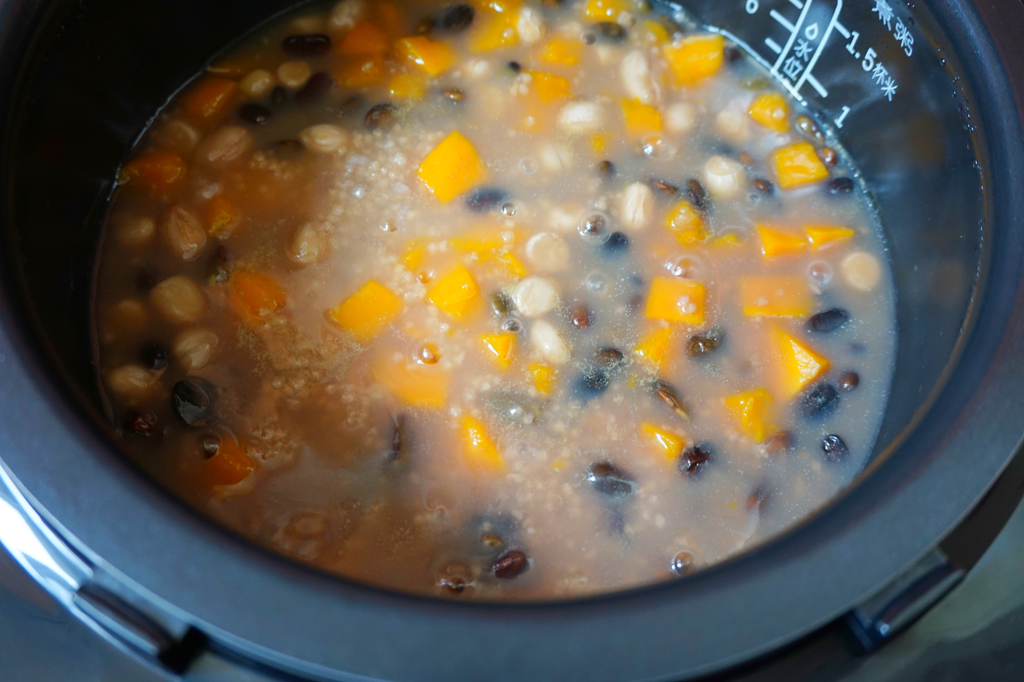 【烹饪食材】:黑豆适量,糯米适量,大米适量,小米适量,南瓜一块,花生少许。