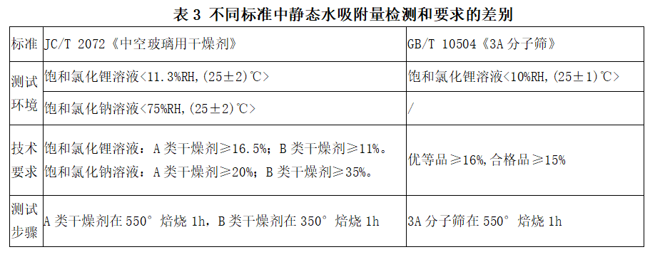 由表3可以看出行业标准和国家标准对于静态水吸附量检测和要求的差异主要在测试的相对湿度环境和技术要求两方面。行业标准中,在相对湿度是75%的时候要求了两种干燥剂的吸附容量,这个设置初衷应是两种干燥剂的应用条件不一样,所以要求就不一样。但从中空玻璃的实际应用工况出发,如果玻璃内腔相对湿度75%时,对应的露点温度是20℃,这与中空玻璃性能要求相违背。以建筑用中空玻璃举例,全国大部分地区都有20℃以下的气候环境,这个时候虽然干燥剂检测合格但是玻璃实际上已经结露失效了,所以高湿度条件下干燥剂的吸附量再高,对于中空玻璃的应用也是没有实际意义的。