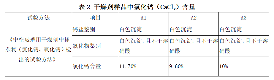 按照标准编制要求:以凹凸棒土为主体材料,那通俗来讲凹凸棒土就应该是主要作用成分。但实际上,凹凸棒土虽有一定的干燥作用,但它在低湿度环境下的深度干燥能力较弱,较硅胶、活性氧化铝的干燥能力差距很大,比3A分子筛就差距更大。标准技术指标中在温度25℃±2℃、相对湿度11.3%时,对3A分子筛的静态水吸附量要求要达到自身重力16.5%;而对B类干燥剂的要求,是同样条件下B类干燥剂要达到自身重量的11%,这个数值虽然比3A分子筛低,但是如果是纯粹的凹凸棒土干燥剂,达到这种吸附能力几乎是不可能的,从相关文献也查不到,从实践中也找不到这种纯凹凸棒土干燥剂材料。而由表2 干燥剂样品中氯化钙含量可以判断3份样品中均掺杂了9%至11%不等含量的氯化钙成分。氯化钙作为一种常用干燥剂,掺杂其中就成为了B类干燥剂的主要作用成分。