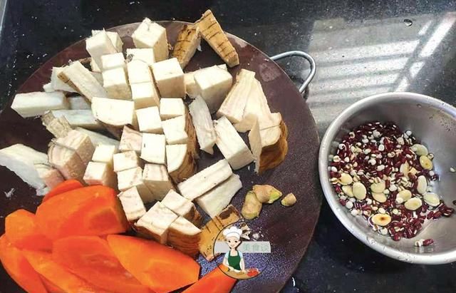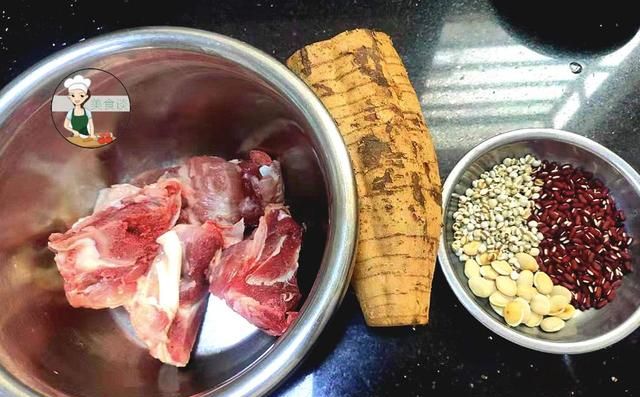 准备食材:猪骨适量、粉葛适量、赤小豆适量、薏米适量、扁豆适量、红萝卜一根。