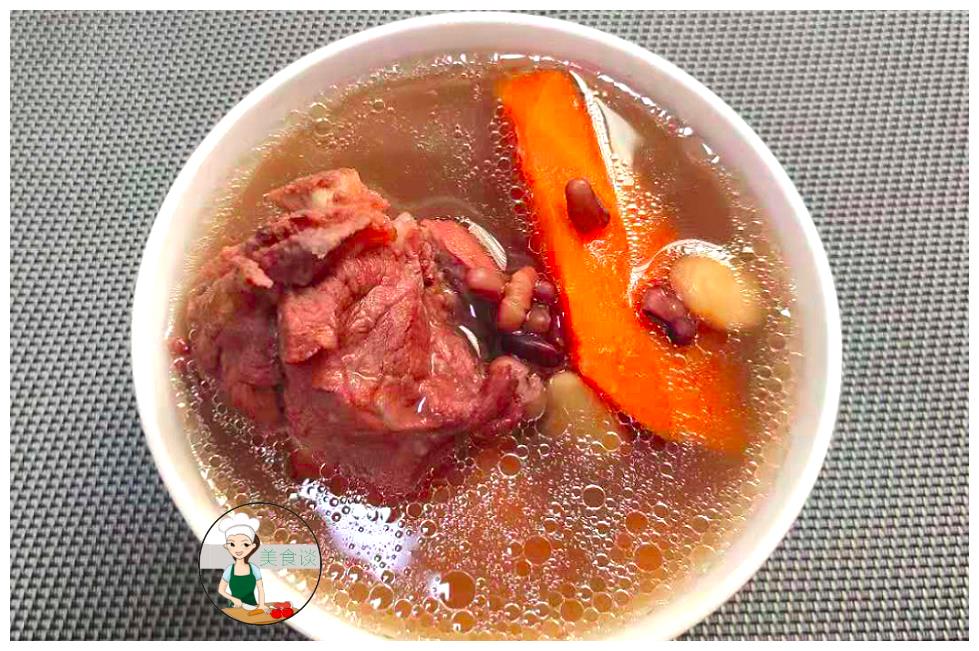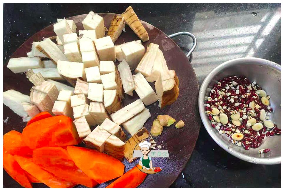准备食材:猪骨适量、粉葛适量、赤小豆适量、薏米适量、扁豆适量、红萝卜一根。
