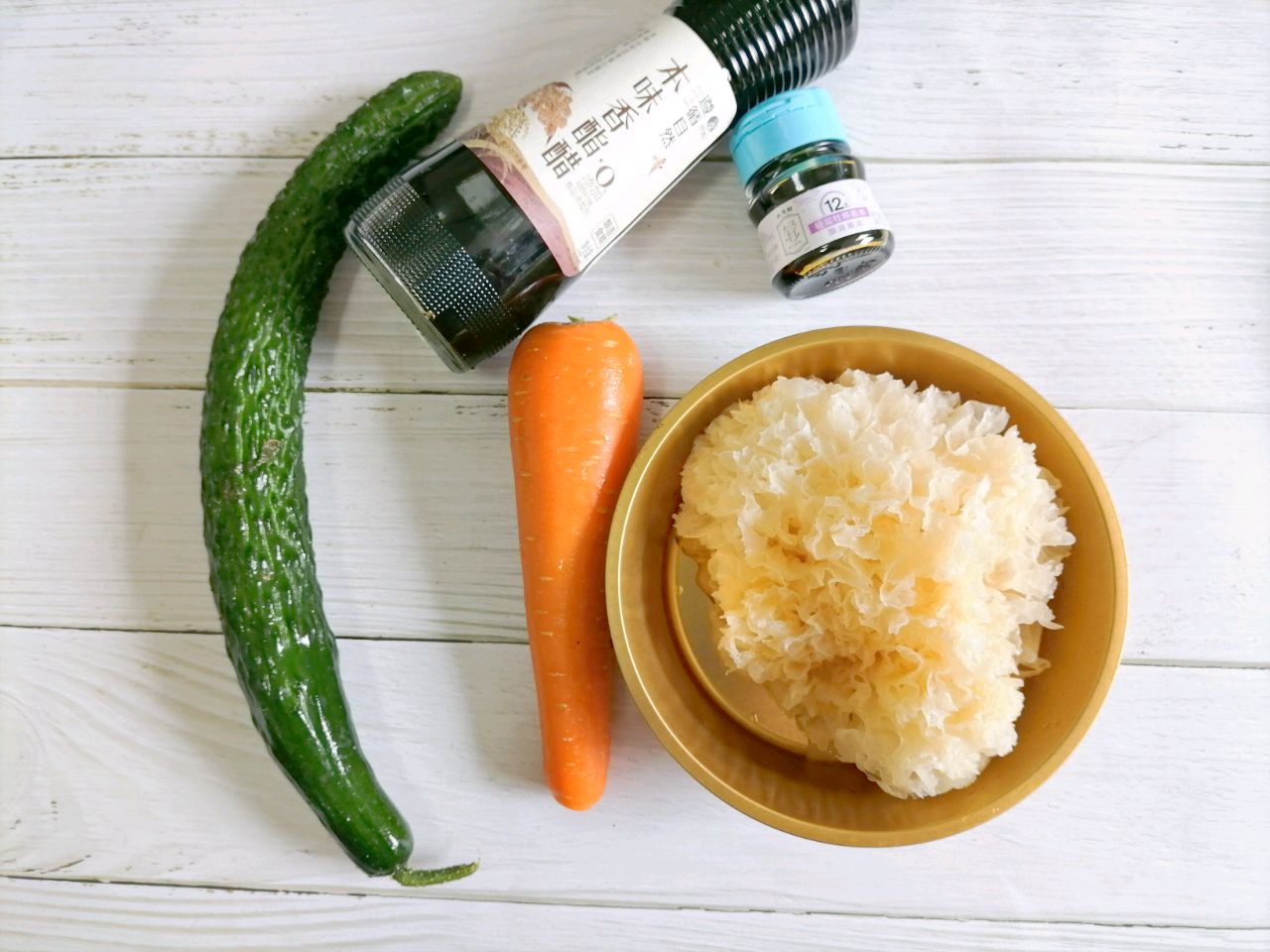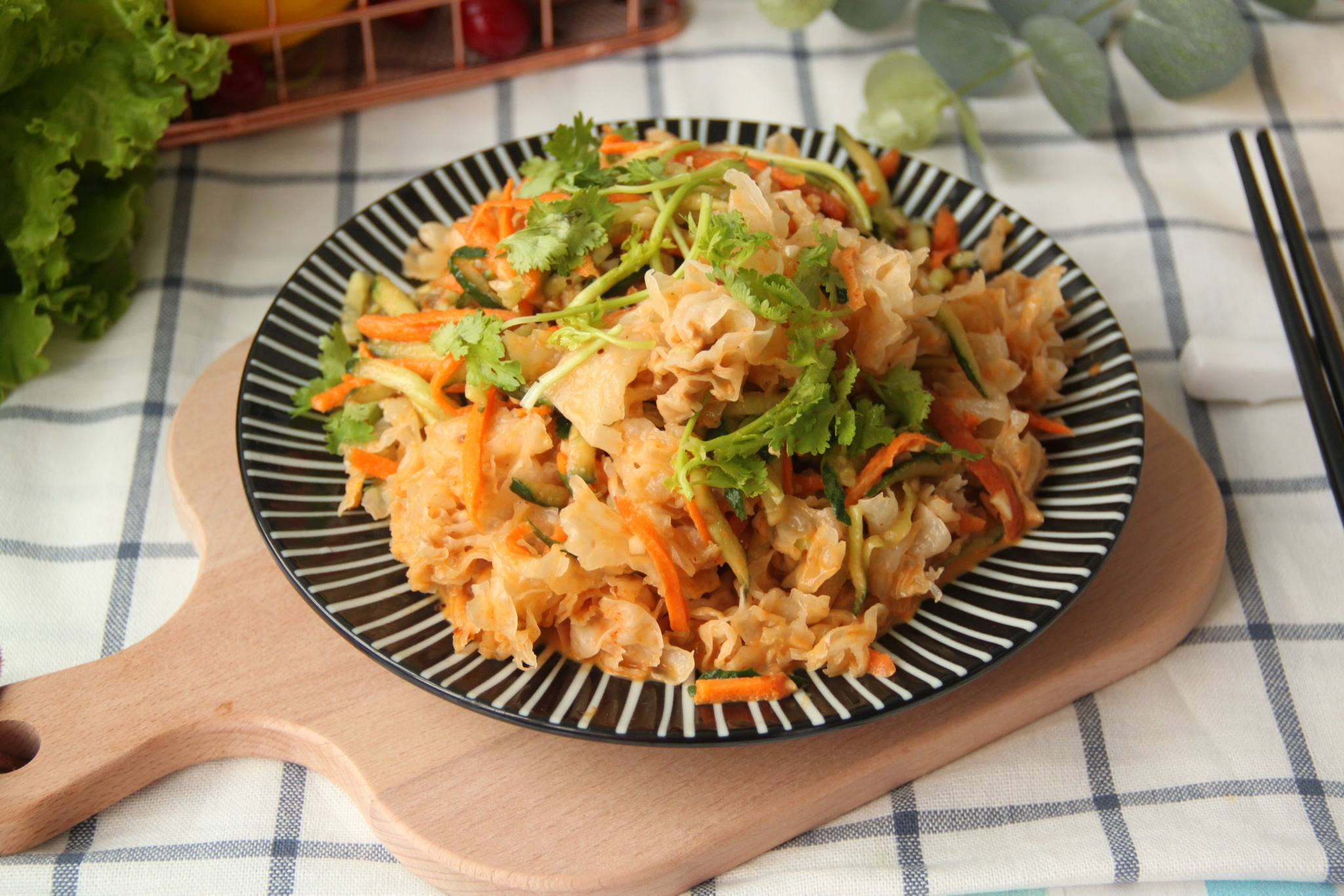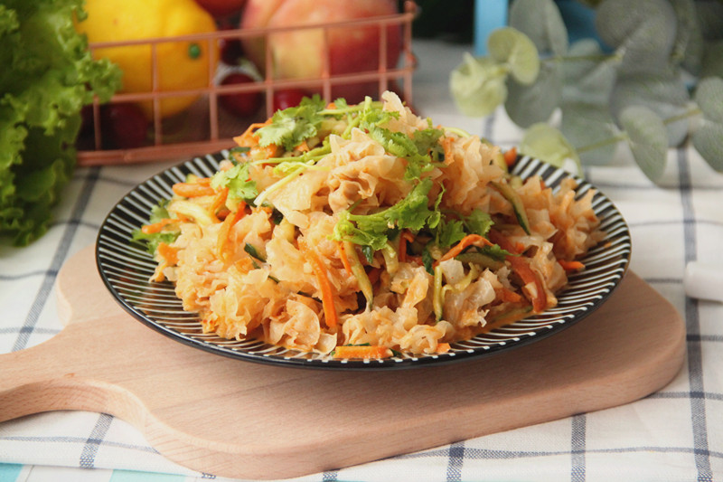 【烹饪食材】:黄瓜一根、生抽一勺、醋一勺、胡萝卜一根、银耳一朵、香菜一根
