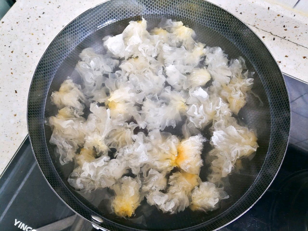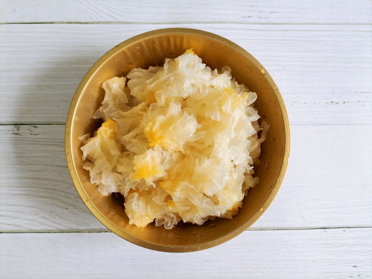 3、银耳需要焯水,但是焯水的时间不能太长,否则会将银耳内部的胶原蛋白煮出来,口感不好了,焯过水之后最好放入冷水中过凉,然后完全冷却了再捞出来挤干水分就可以了。