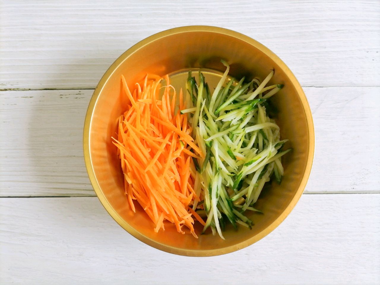 2、将黄瓜清洗干净之后用擦子擦成丝,再将胡萝卜用擦子擦成丝备用。