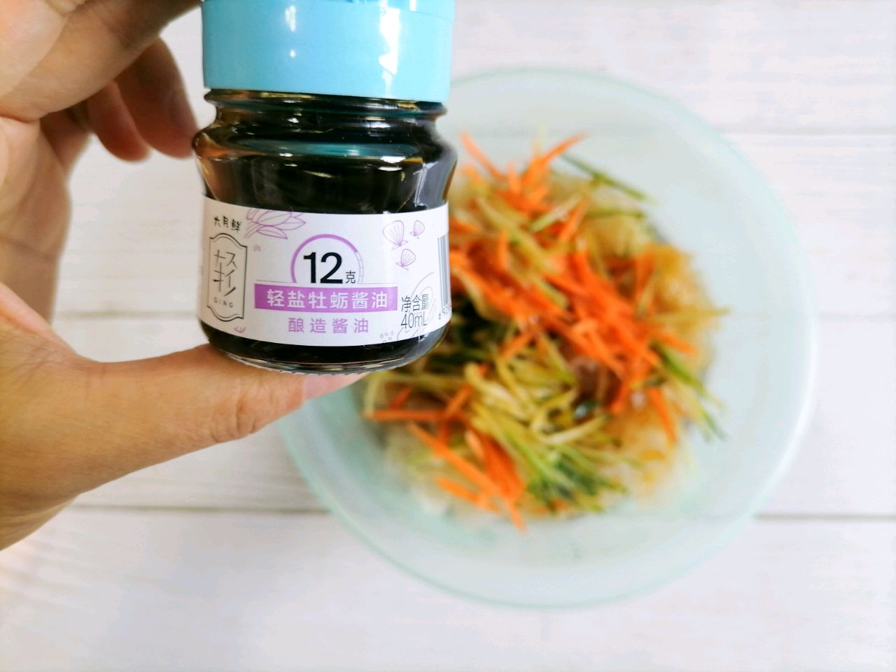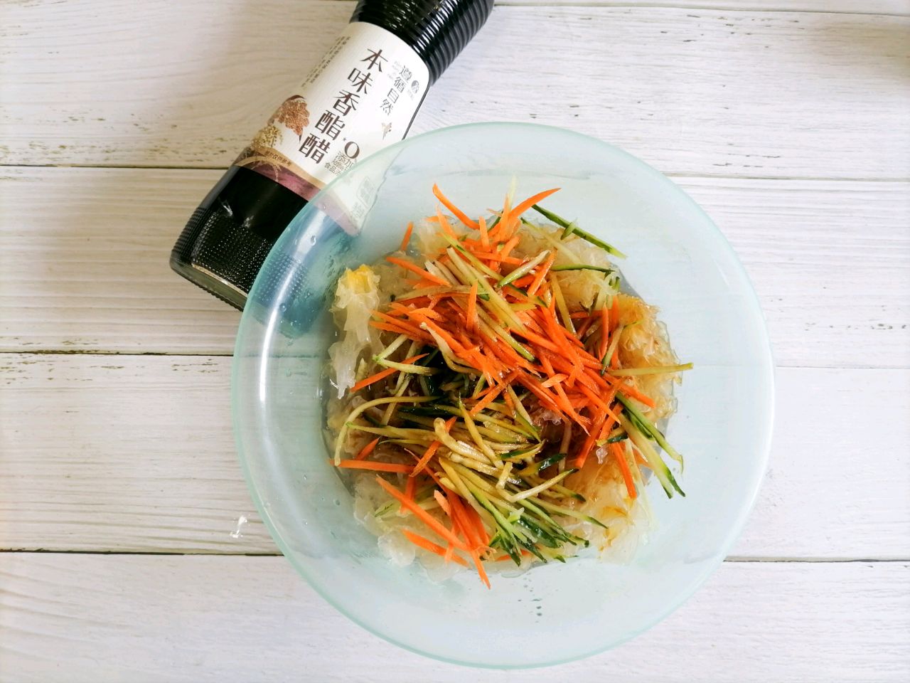 5、再将胡萝卜丝还有黄瓜丝一同放入银耳碗中,加入一勺醋和一勺酱油,用量大家可以根据自己的口味来适当添加即可。