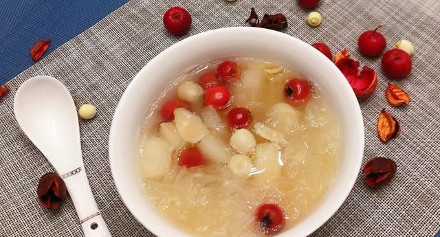 直到保温之后,银耳汤煮好了,这时加入清洗切好的雪梨块、山楂、红枣,去皮或者不去皮都行,再放入少许黄冰糖,盖盖子再焖煮一会儿。