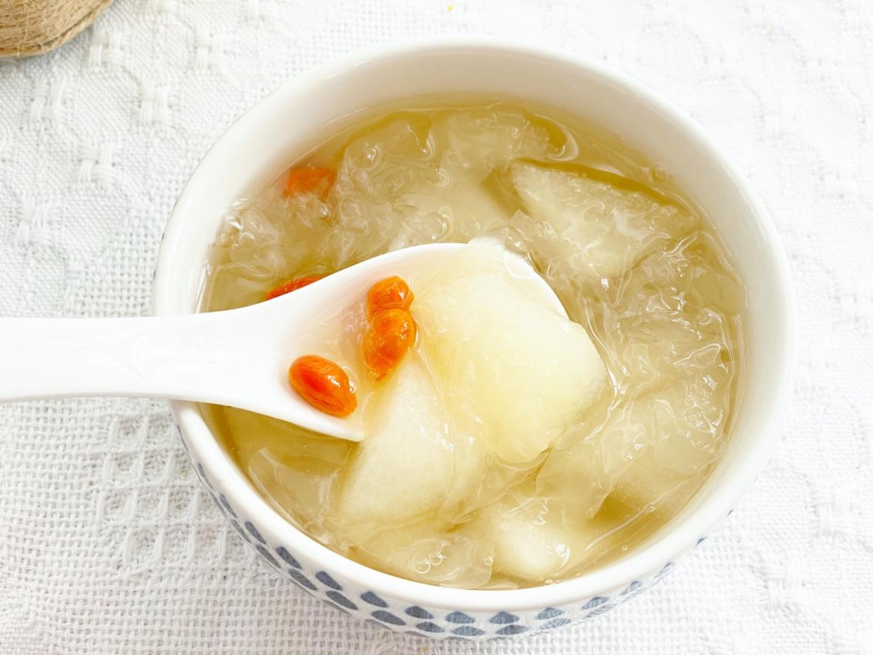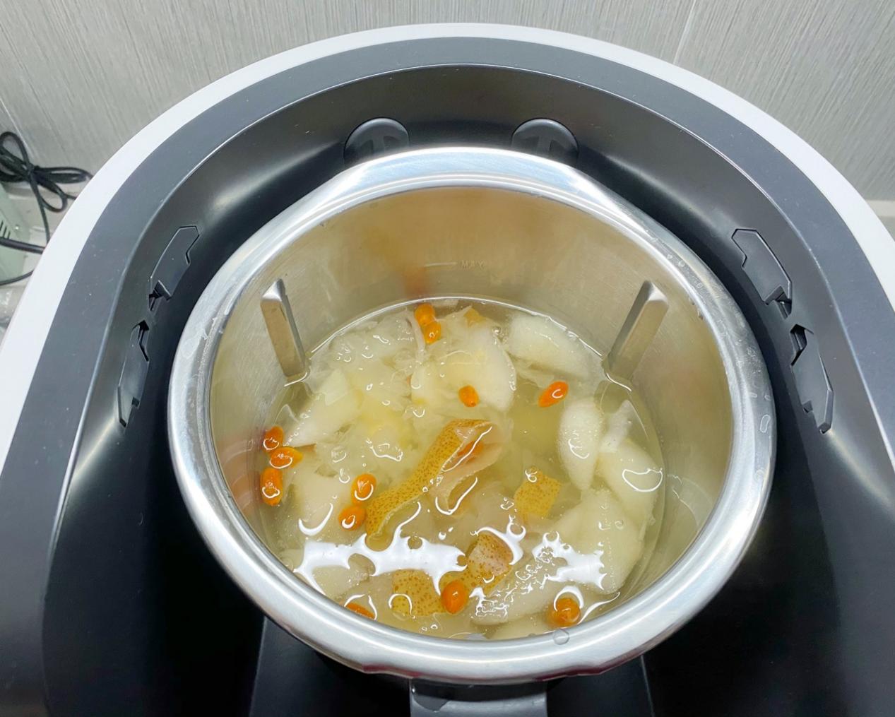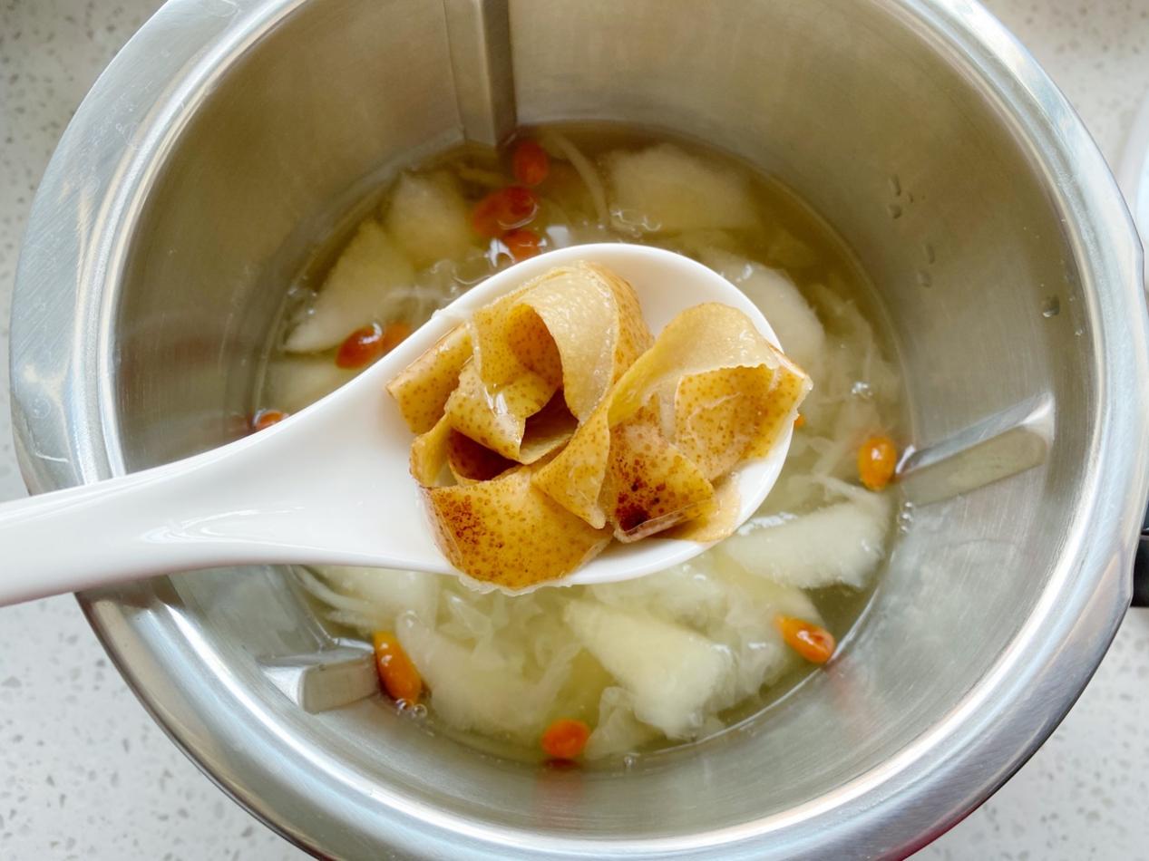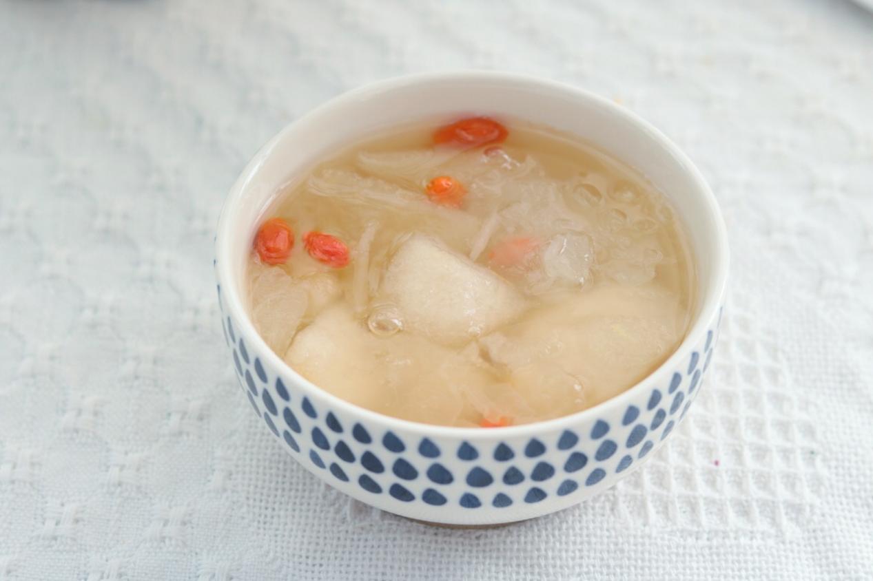 【所需菜品】:大的雪梨1个、新鲜的银耳半朵、枸杞适量、糖适量、清水适量