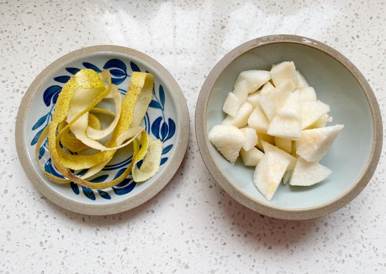 2、雪梨的皮削掉,去核后切成小块状,装在盘子里备用。