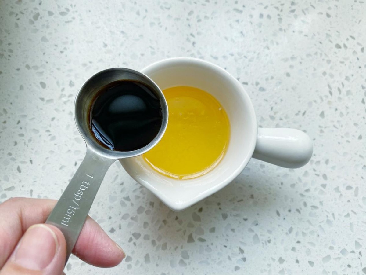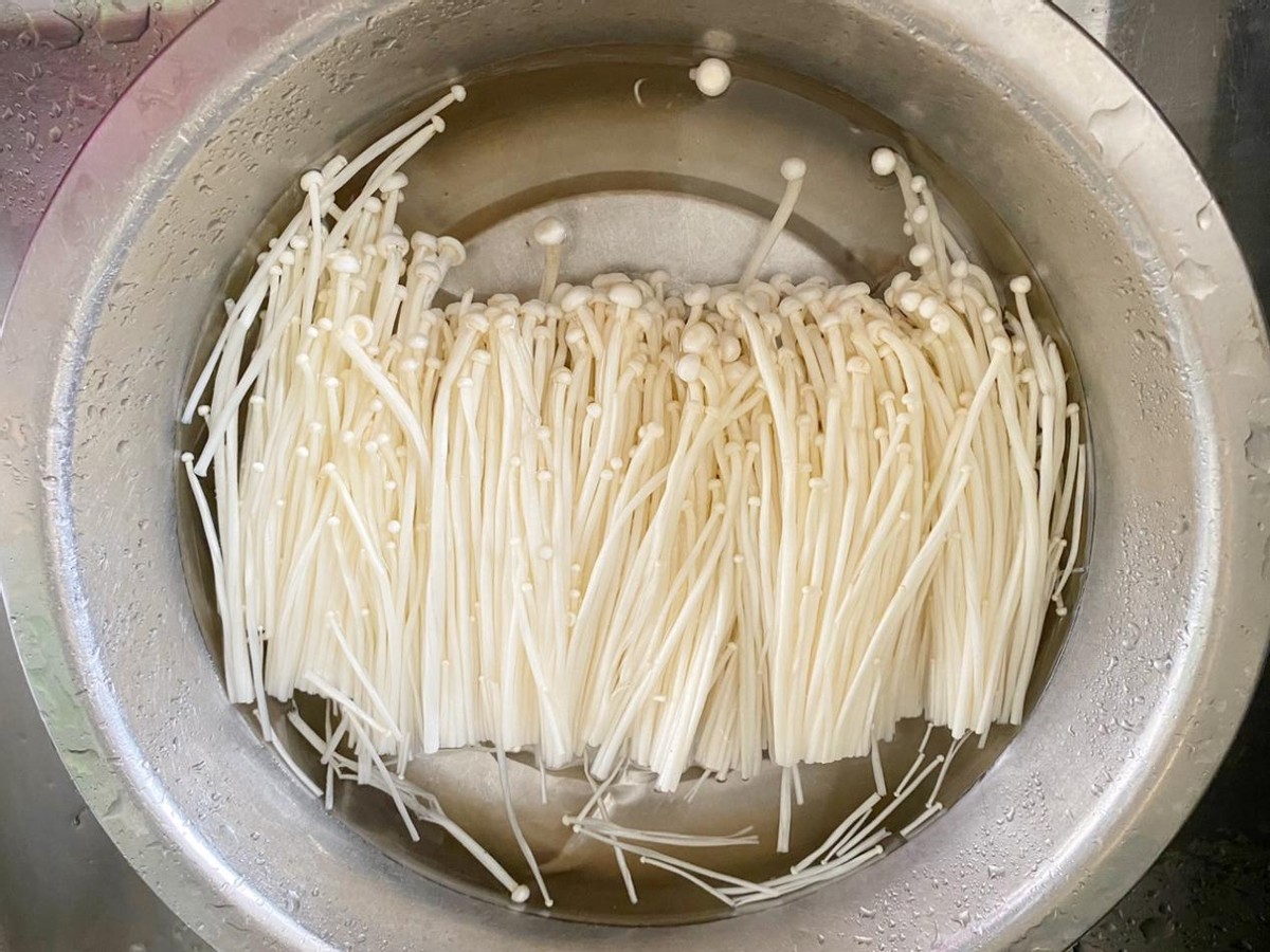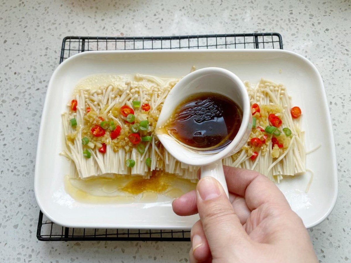 5、距离7分钟结束时,把第二层蒸笼放上,把金针菇放在里面,时间到了之后取出金针菇,把里面的水倒出,用半勺蚝油和一勺生抽调成料汁倒在金针菇上。