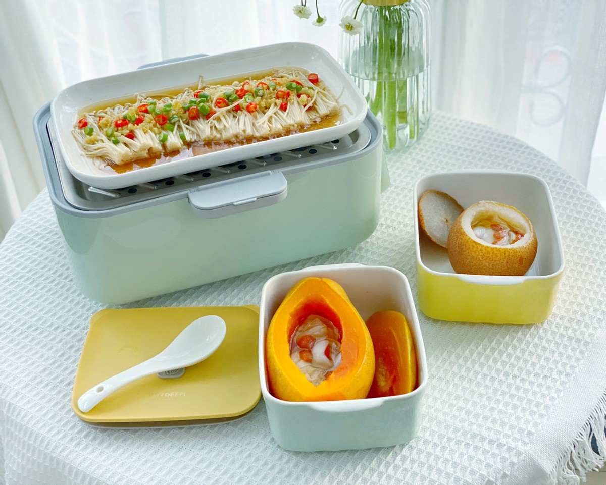 4、做好这些食材后,分别放在陶瓷盘里,先把木瓜和雪梨放在电炖锅里,打开电炖锅,按下蒸功能,时间设置半小时。