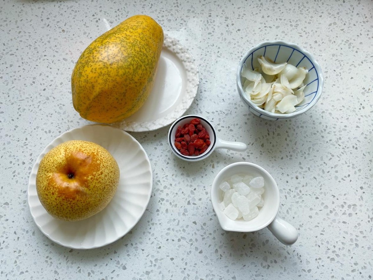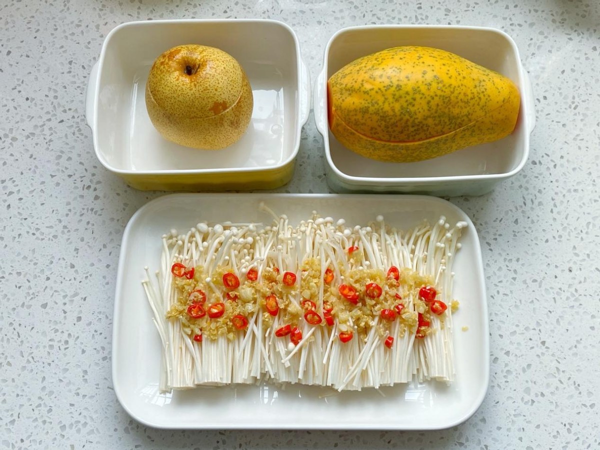 1、准备好所有的食材和配料,木瓜和雪梨在清洗时加点盐,用力搓洗下表面,鲜百合和枸杞洗干净,金针菇清洗后去掉根部,泡在清水里五分钟,土腥气就会去除,沥干水分后放在盘里备用,大蒜切成粒,小米辣和大葱切成圈。