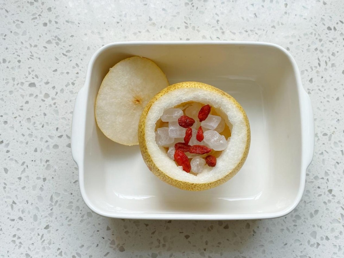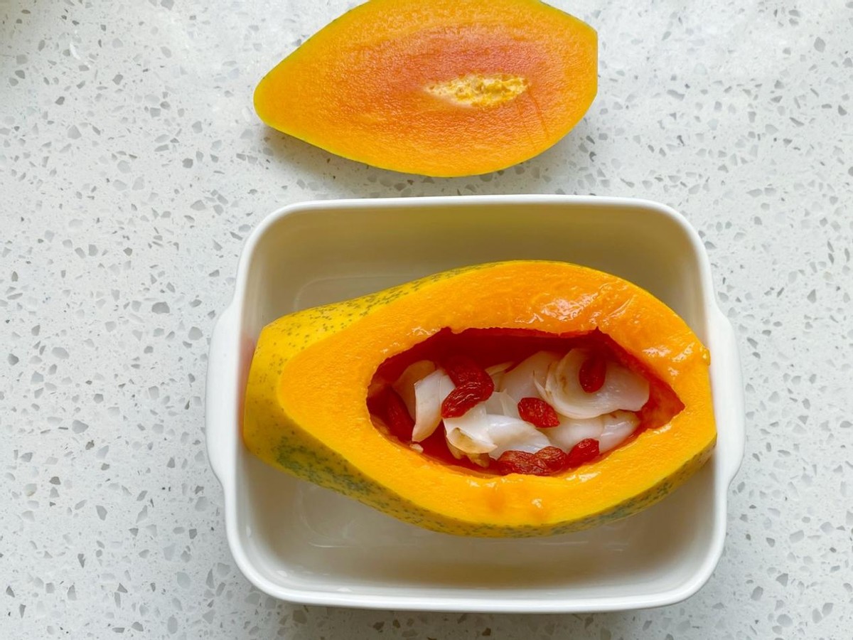 3、把木瓜切开,要找到三分之一的位置切,挖出里面的木瓜籽后,把百合和枸杞放在里面。雪梨从顶部切开,挖出雪梨籽后放入枸杞、百合和适量冰糖。