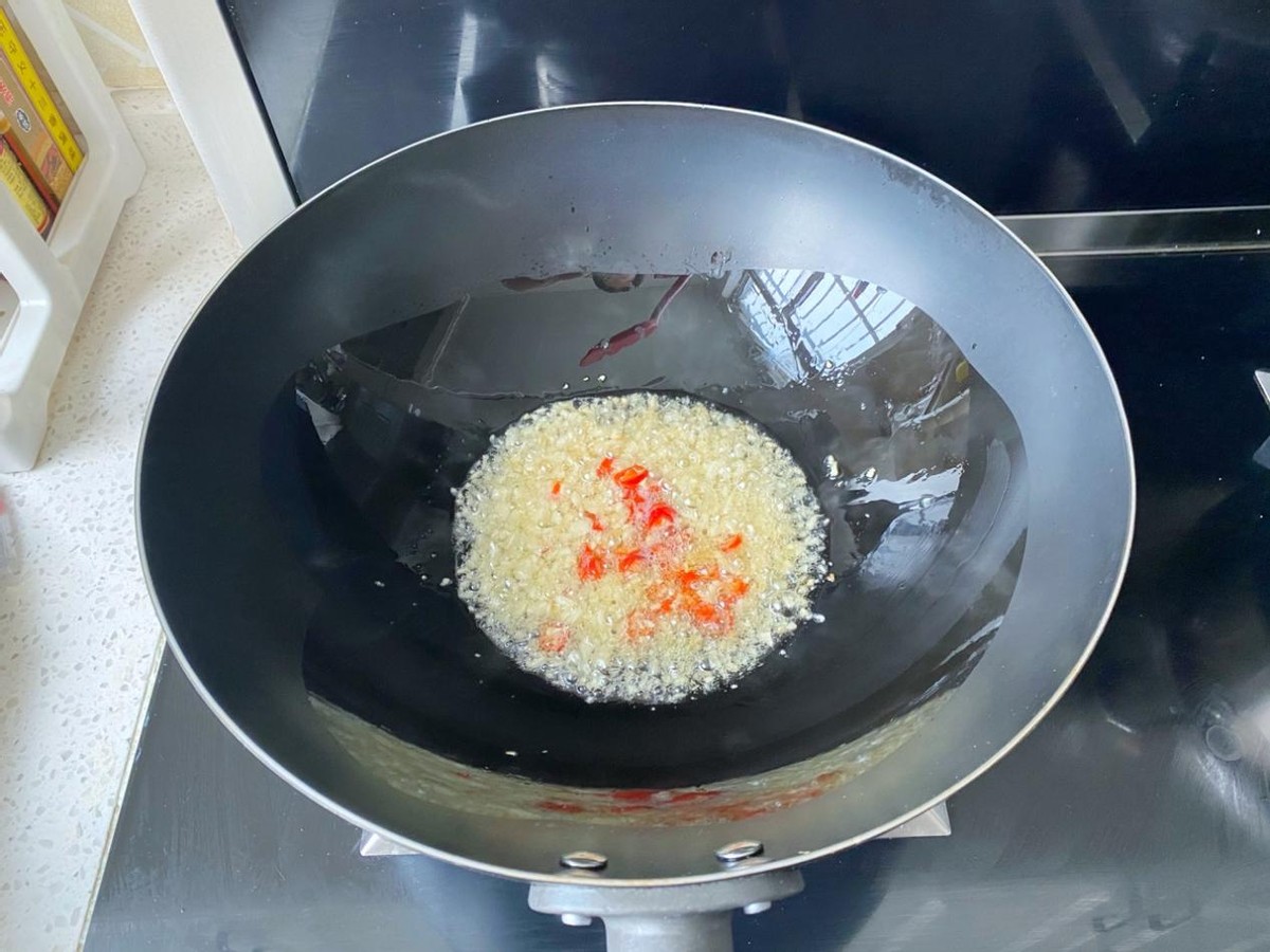 2、在油锅里倒入适量的植物油,放入蒜粒和小米辣炒出香味就能关火了,然后直接倒在摆好的金针菇上面,倒的时候要均匀些。