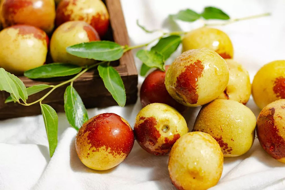 挑选技巧:枣在生长的过程中要历经由绿变黄,由黄变红的过程,所以自然条件下长出的枣,不会是全红的,会红中带着黄的,并且过渡自然。另外新鲜的枣子摸起来手感硬实。最简单的方法便是我们尝一颗,相信老板也不会阻拦,优质的鲜枣吃起来皮薄果肉甜。