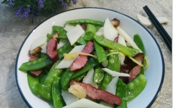 材料:腊肉150克,荷兰豆250克,山药200克,适量油,生姜2片,大蒜2片
