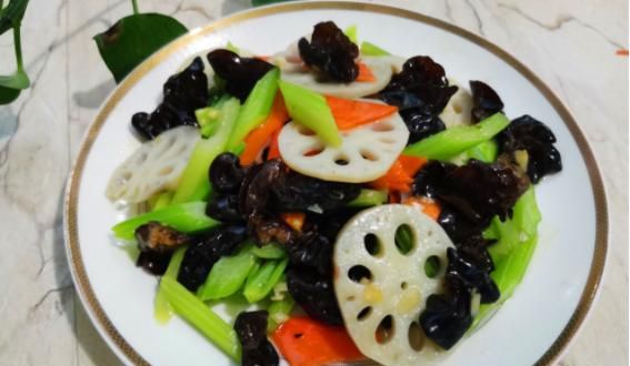 材料:莲藕1个,芹菜一根,木耳(干)少许,胡萝卜1根,油、盐、蒜,鸡精,淀粉。
