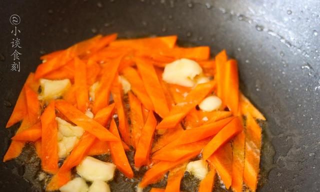 4、另起锅放入植物油,把它烧热以后,放入大蒜进行爆香,接着把胡萝卜放进去炒,炒香炒熟透,放入黄瓜。